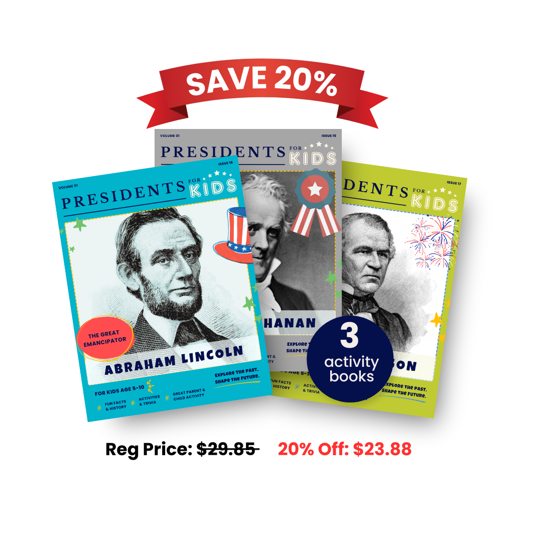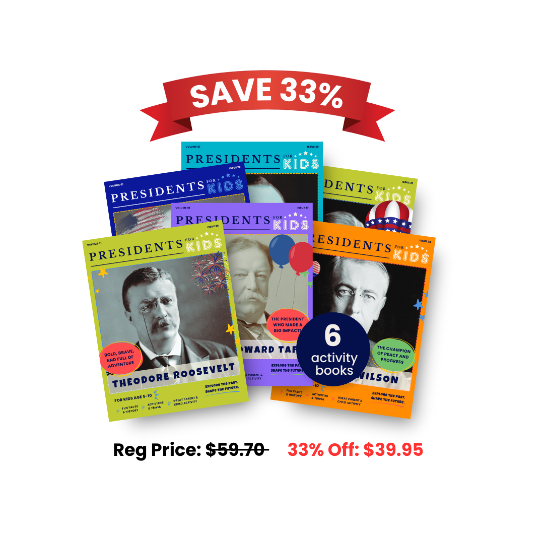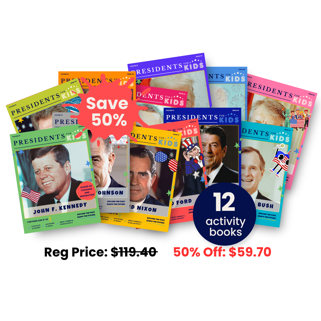 Each set brings together multiple 24-page activity books that profile U.S. Presidents in a kid-friendly, engaging way—complete with historical fun facts, trivia, coloring pages, inspiring quotes, and hands-on activities.