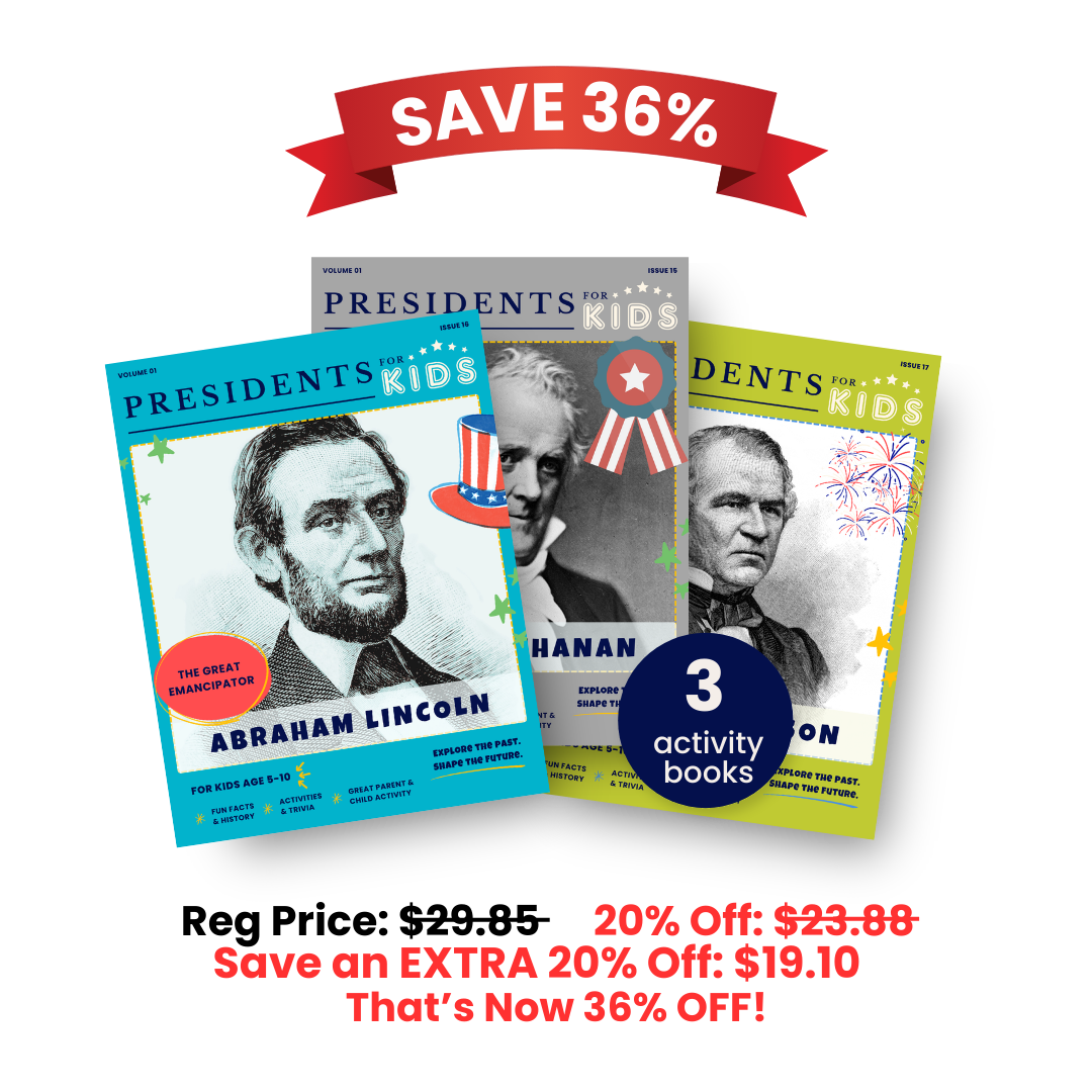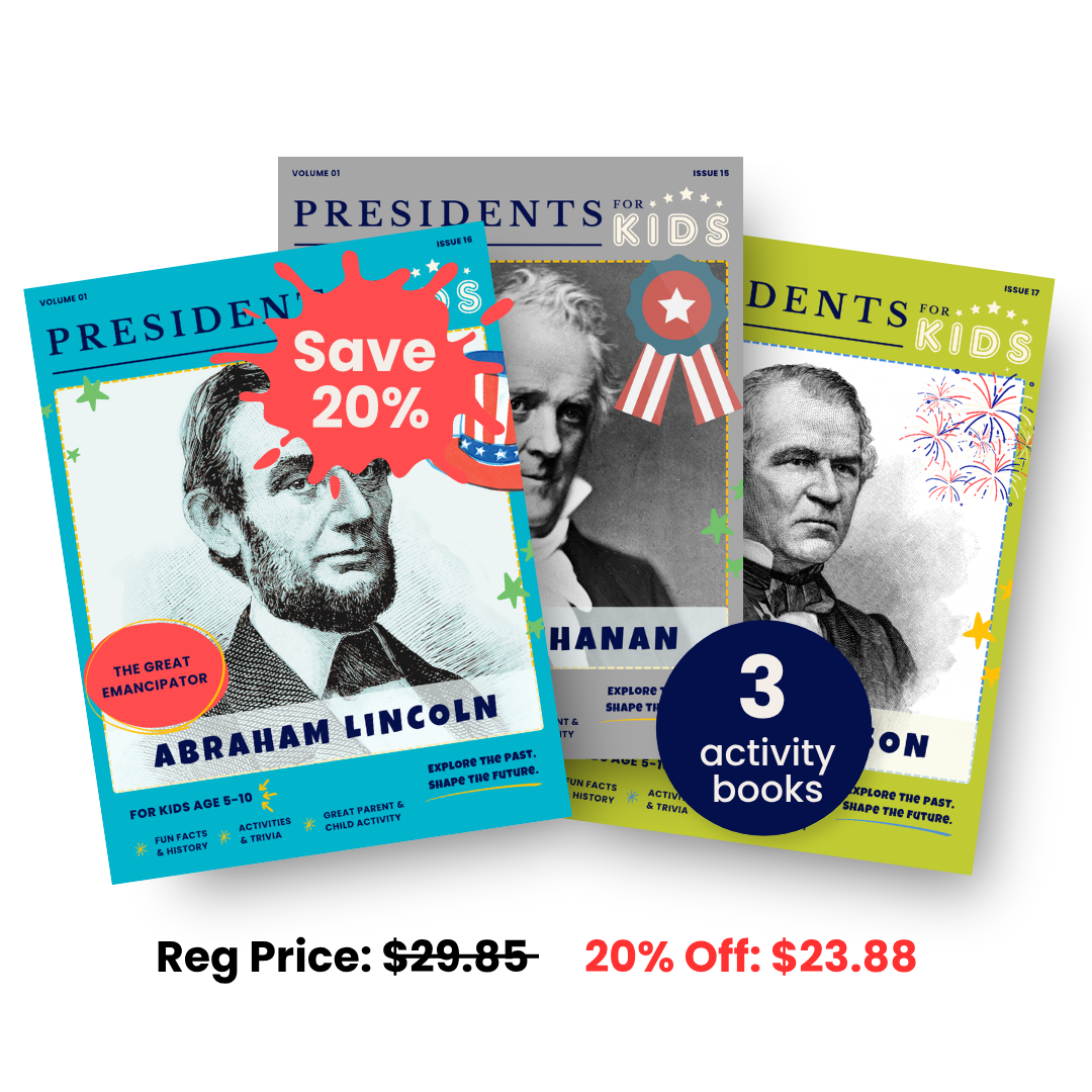 Step into one of America’s most defining eras with the Civil War: Before, During, and After Collectors Set from Presidents for Kids! This gripping collection of 3 activity books takes young readers through the turbulent times of the Civil War, spotlighting three U.S. Presidents who navigated the nation on the brink of division, through conflict, and into recovery. Ideal for kids ages 5-10, each 24 page activity book dives into a different President’s story with fun facts, interactive activities, and compelling narratives that make history unforgettable.