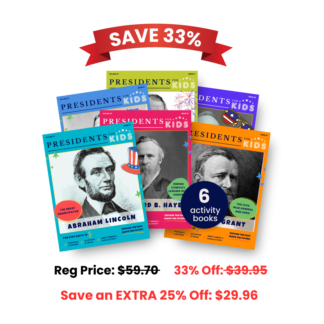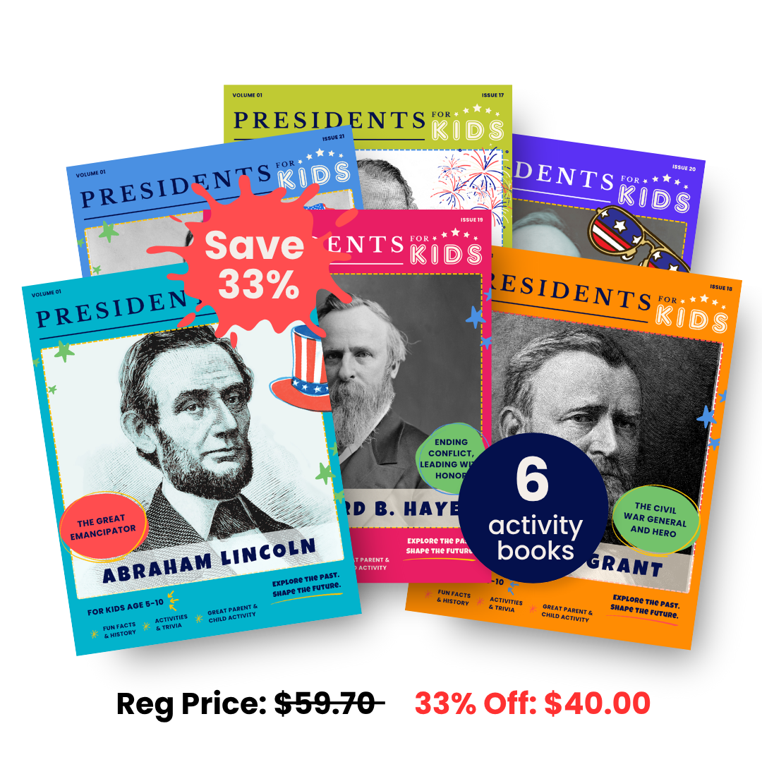 Step into one of America’s most pivotal eras with the Civil War & Beyond Collectors Set from Presidents for Kids! These captivating 6 activity books will bring young readers through the lives and legacies of six U.S. Presidents who navigated the nation’s greatest challenges—war, reconstruction, and renewal—with strength and resolve. Designed for kids ages 5-10, each 24 page activity book focuses on a different President and is packed with fun facts, engaging activities, and compelling stories that bring this transformative period to life.
