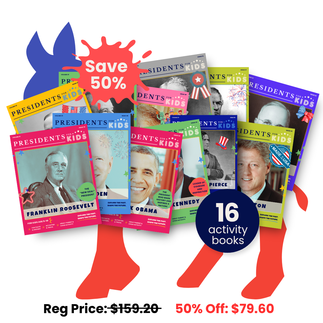 Dive into the impactful legacy of America’s Democratic leadership with the Democratic Presidents 16 Activity Book Collectors Set from Presidents for Kids! This comprehensive collection takes young readers on a journey through the lives of sixteen U.S. Presidents from the Democratic Party, whose bold visions and transformative policies shaped the nation from its early days to the modern era. Perfect for kids ages 5-10, each 24 page activity book spotlights a different President with fun facts, interactive activities, and captivating stories that make history come alive.
