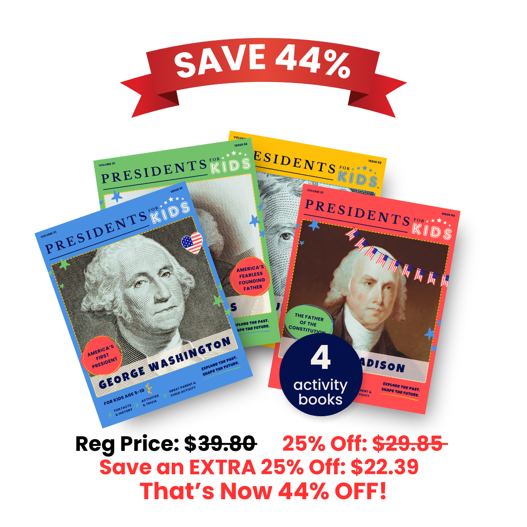 Journey back to the birth of the United States with The Founding Fathers Collectors Set including 4 activity books from Presidents for Kids! This remarkable collection celebrates four visionary Presidents who laid the cornerstone of American democracy. Perfect for kids ages 5-10, each 24 page activity book focuses on a different founding father, brimming with fun facts, interactive activities, and engaging stories that bring the early days of the nation to life.