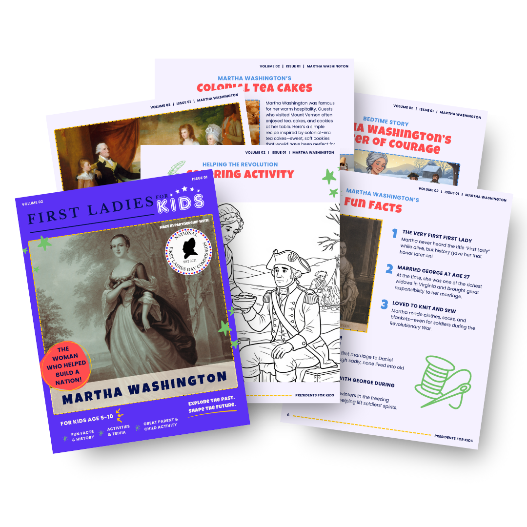 Celebrate America’s most legendary First Ladies with The Founding First Ladies Collector Set - including 3 Activity Books from Presidents for Kids! This handpicked collection takes young readers on an unforgettable journey through the lives of three iconic First Ladies. Perfect for kids ages 5-10, each 24 page activity book spotlight a different First Ladies with fun facts, interactive activities, and captivating stories that bring history’s greatest moments to life.