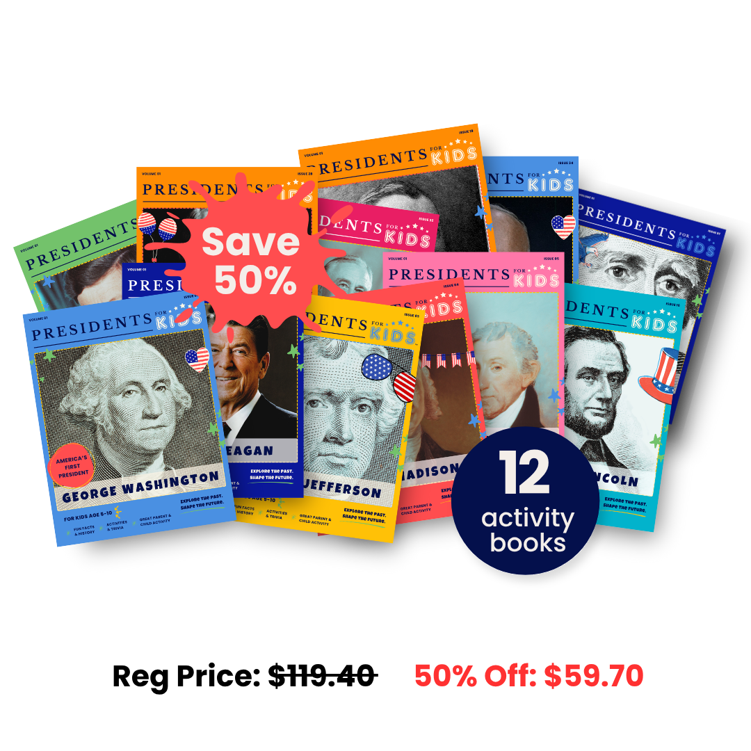 Unlock the fascinating history of America's most iconic leaders with the Warriors and Peacemakers Collectors Set from Presidents for Kids! These special 12 activity books take young readers on an exciting journey through the lives and legacies of twelve U.S. Presidents who shaped the nation with their courage, vision, and determination. Perfect for kids ages 5-10, each 24 page activity book focuses on a different President and offers fun facts, engaging activities, and captivating stories that bring history to life.